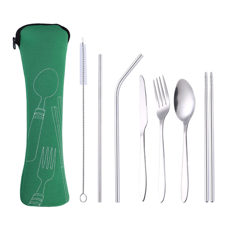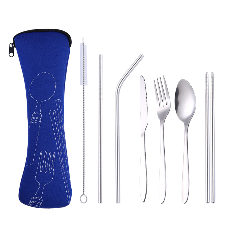 This portable cutlery set is made of high quality stainless steel with a neoprene carrying bag. Durable and reusable, convenient to carry for traveling. The cutlery set includes 1 straight straw, 1 bent straw, 1 brush, 1 spoon, 1 fork, 1 knife, 1 pair chopsticks and a storage bag. Equipped with a storage bag, it takes up little space and can be easily put into a backpack, handbag or luggage. Great for office, school, lunch, travel, camping, picnic, hiking and other outdoor activities, etc.