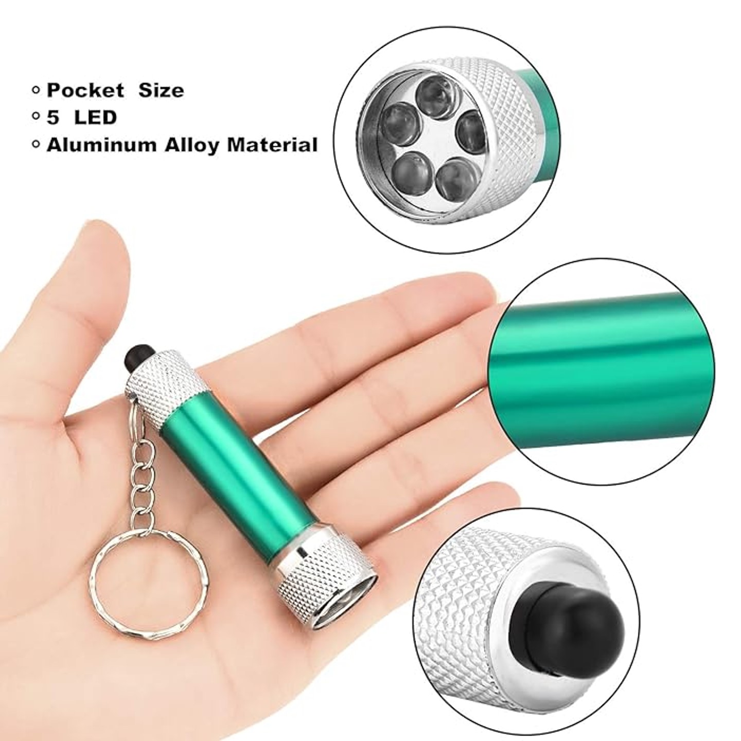 Our mini 5 LED flashlights keychain is made of aluminum alloy and plastic,each mini flashlight powered by 3 button batteries,easy to carry, can be put into the handbag, wallet or pocket,suitable for camping, walking at night, traveling, power outages.