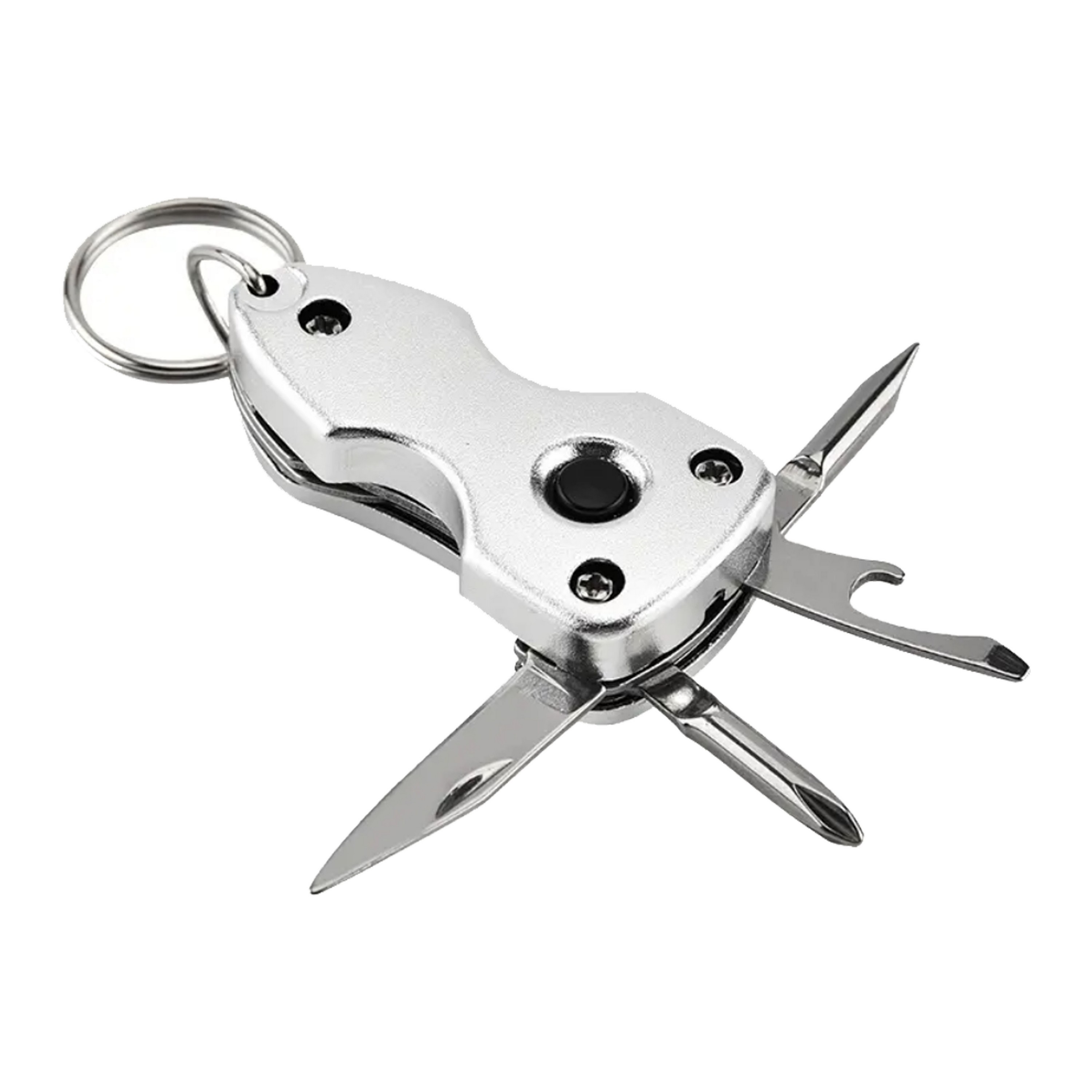 The key chain is made of stainless steel. There is 1 Awl, 1 Bottle Opener, 1 knife, 1 LED light and 1 Screwdriver. It adapts well to various occasions: fishing, shopping, camping, hiking, travel and cycling.