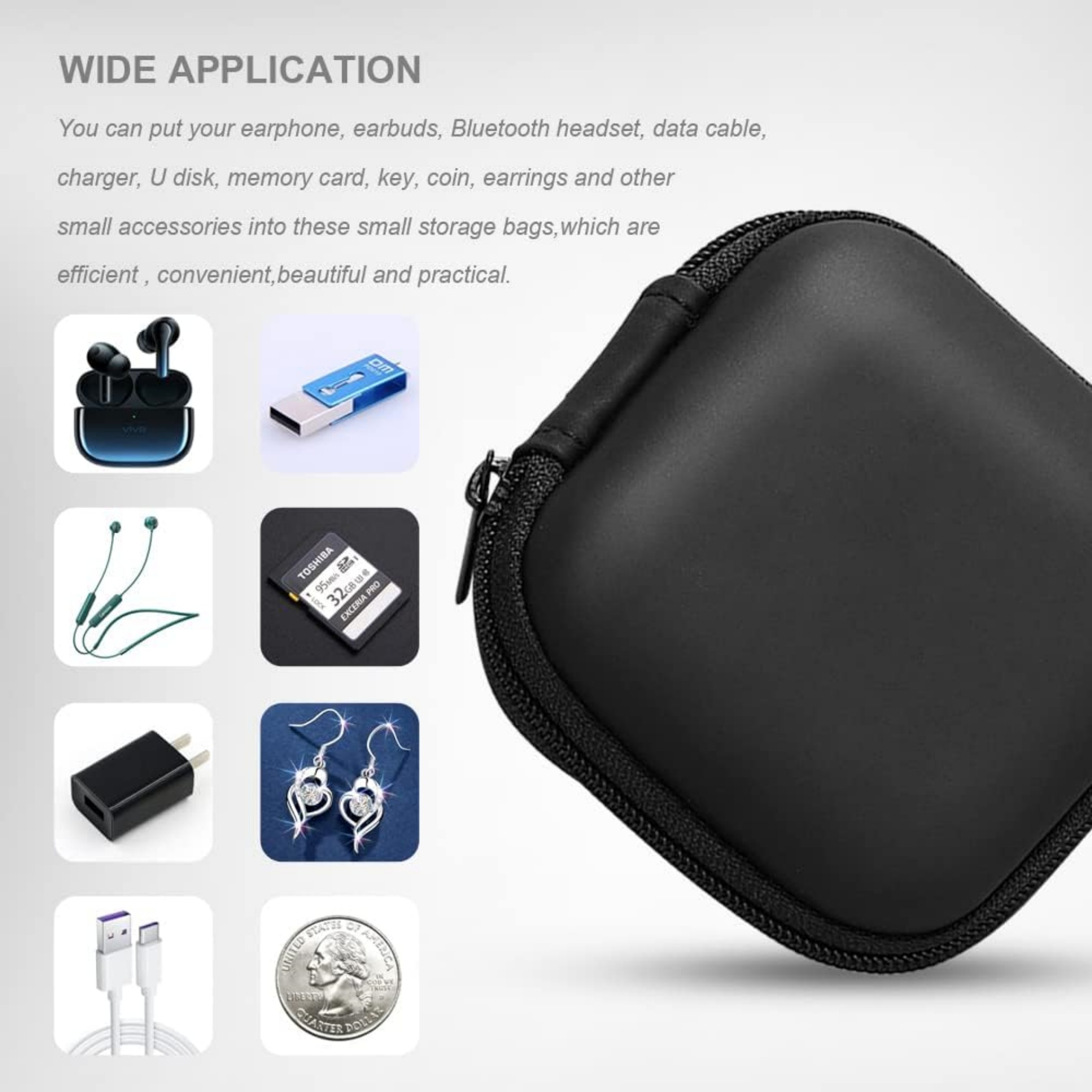 The headphones storage is advanced EVA material, can keep earphones, MP3, keys, USB cables, memory card, USB flash disk and more small accessories. Mini size can easily fit into the pocket and hand bag, convenient for daily life and travel.